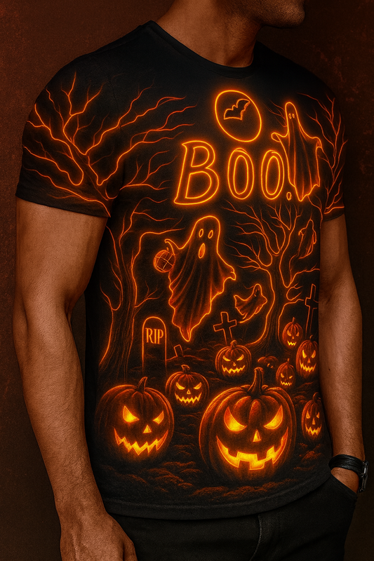 3D Neon Glow Halloween Ghost & Pumpkin T-Shirt – Glow-in-the-Dark Effect
